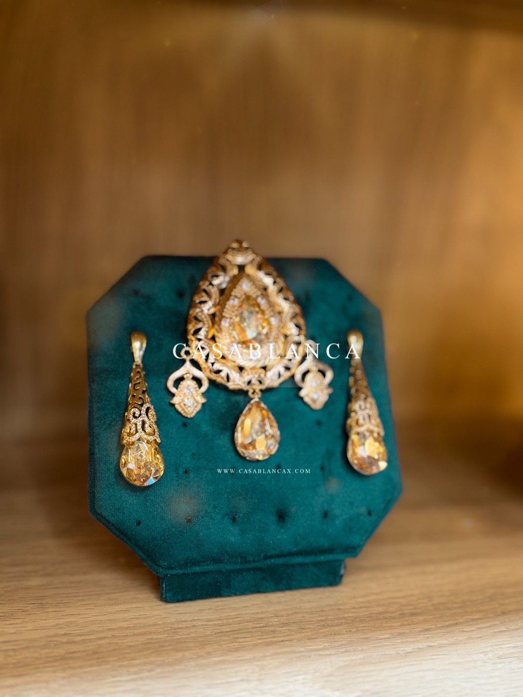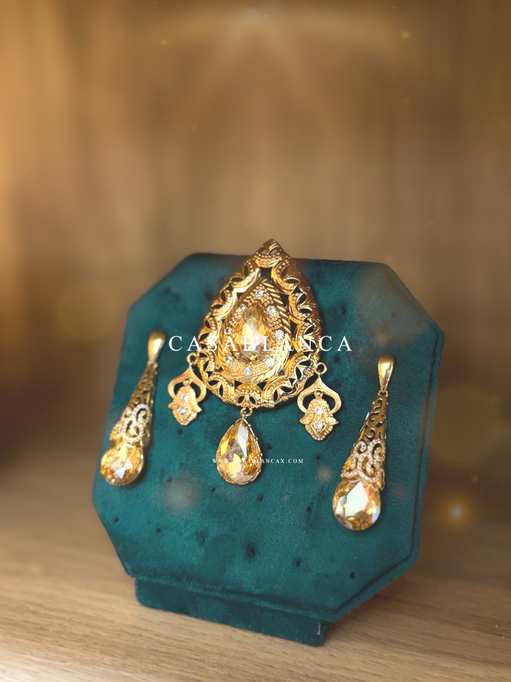Gold brooch and earring set finished with champagne gold stones.