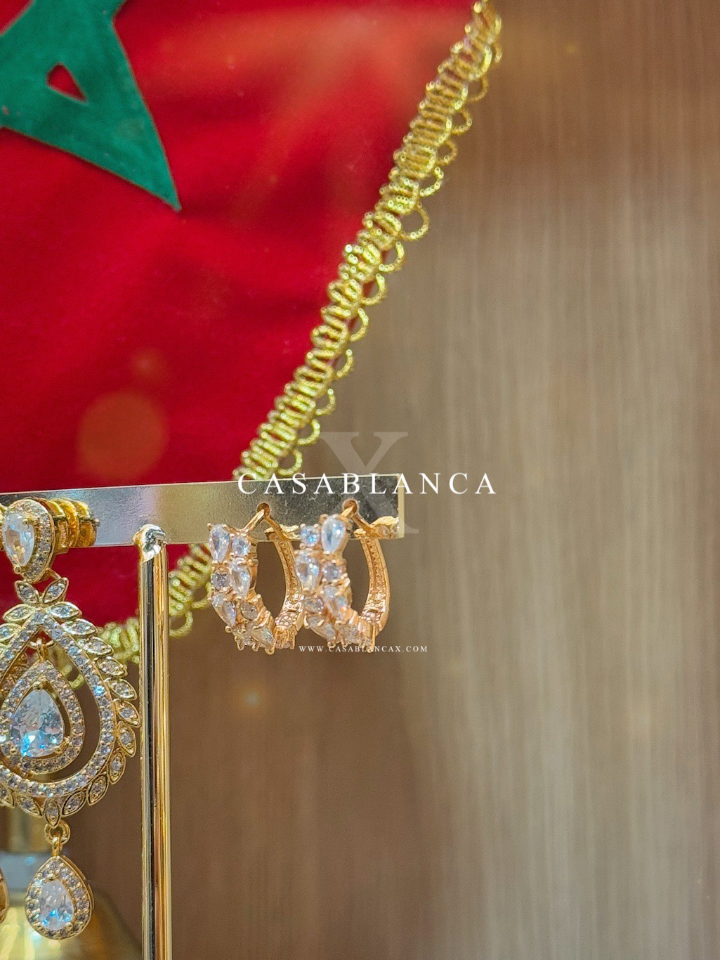 Gold earrings, intricately detailed with quartz stones. Gold-plated. Two exclusive and chic styles. Choose yours: left or right.