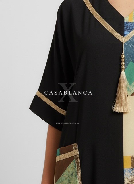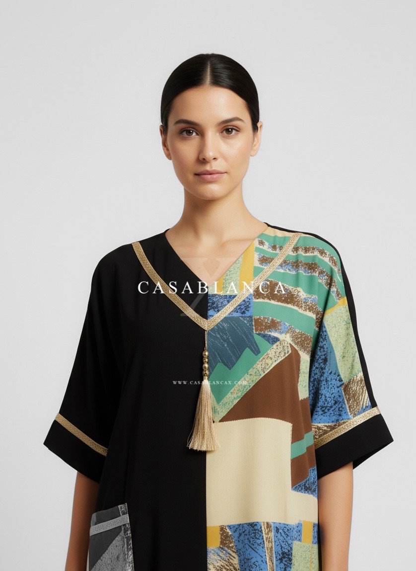 Zwarte kaftan met een gedurfde, kleurrijke abstracte print op de ene helft. Het heeft een V-halslijn geaccentueerd met gouden geborduurd rand. Deze enkellange, losvallende jurk is een moderne interpretatie van de Marokkaanse stijl. One size.