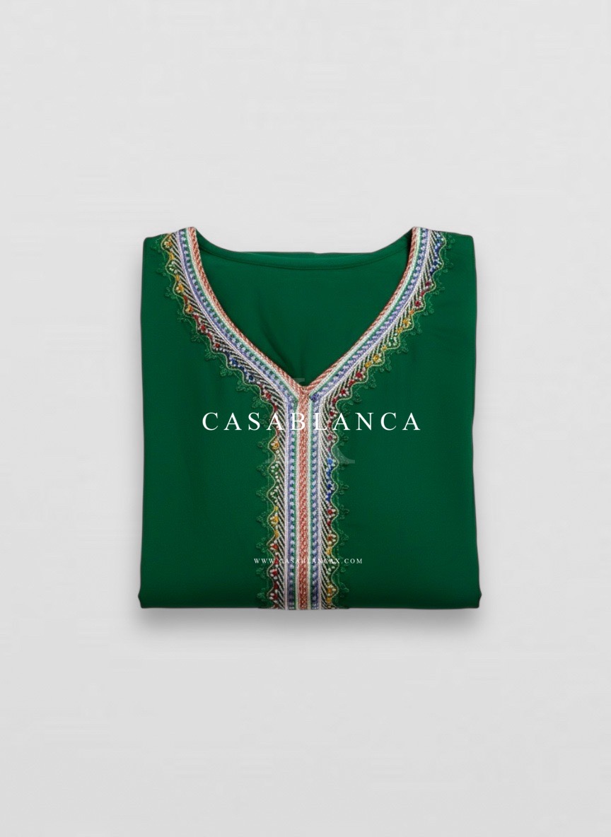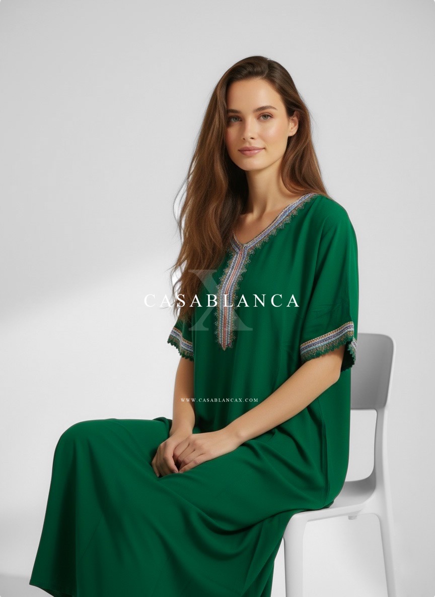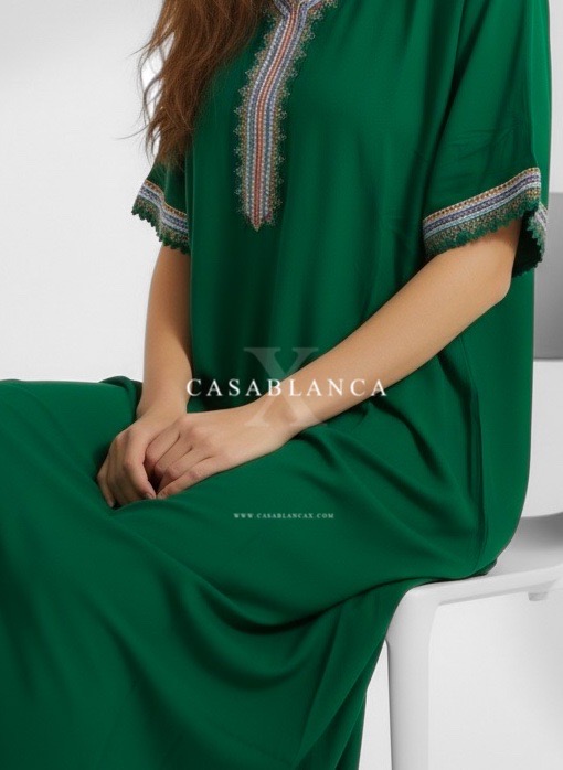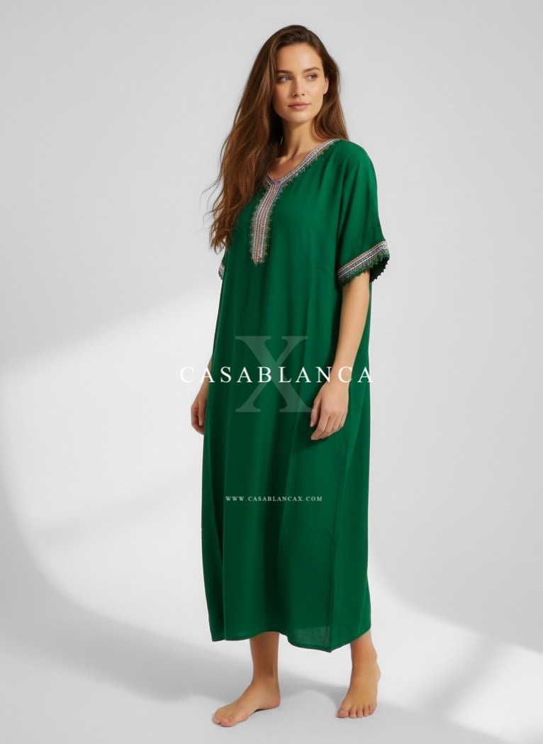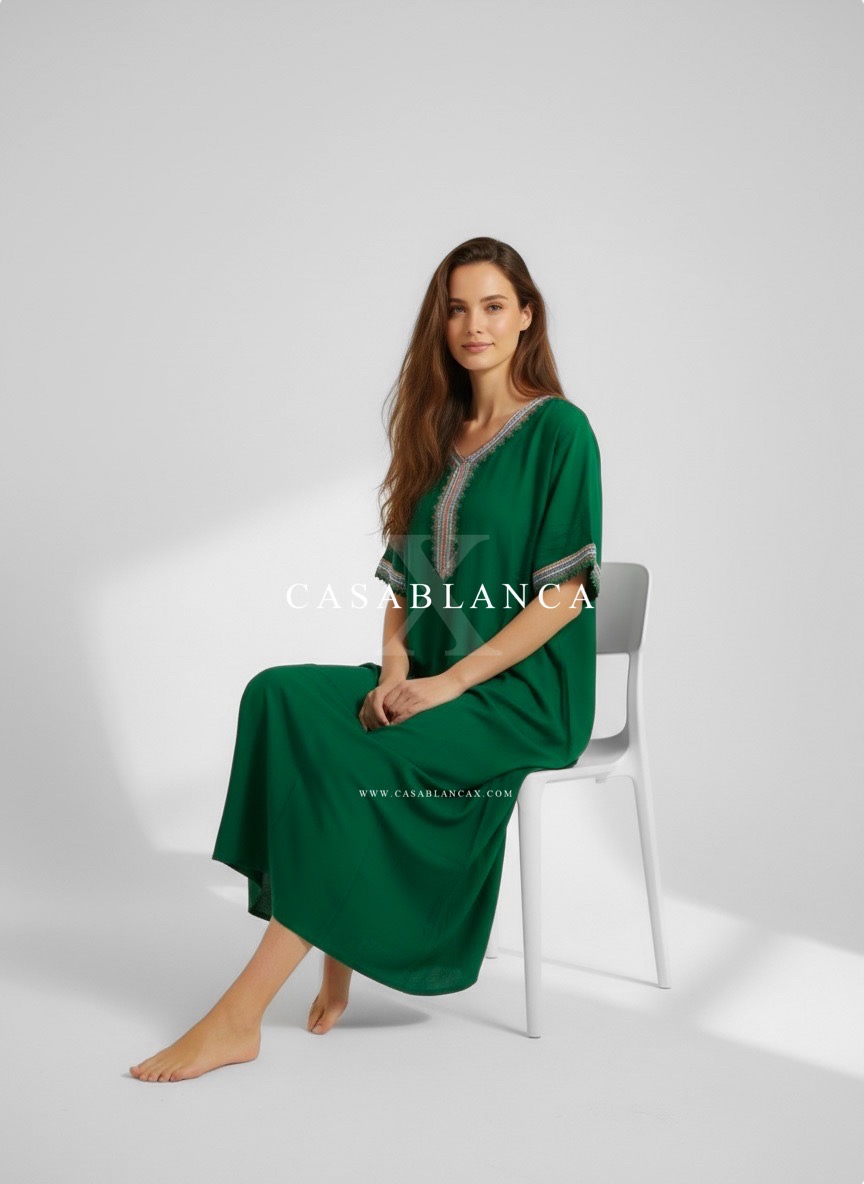 A beautiful deep green Moroccan kaftan/dress with a loose fit and short sleeves. The traditional, multicolored embroidery on the V-neck and sleeves adds a stylish touch. Made of a comfortable, lightweight fabric.
