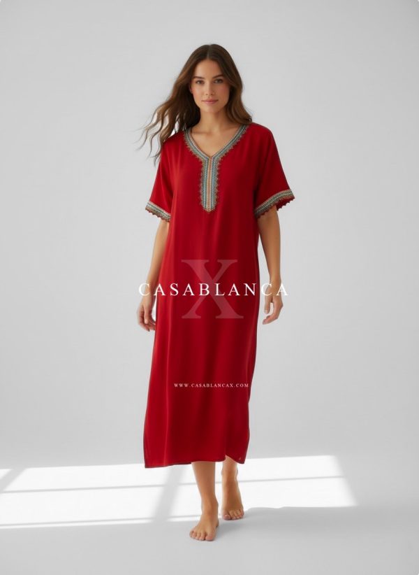 Uno splendido caftano/abito marocchino rosso dalla vestibilità ampia e maniche corte. Il tradizionale ricamo multicolore sullo scollo a V e sulle maniche aggiunge un tocco di stile. Realizzato in un tessuto comodo e leggero.