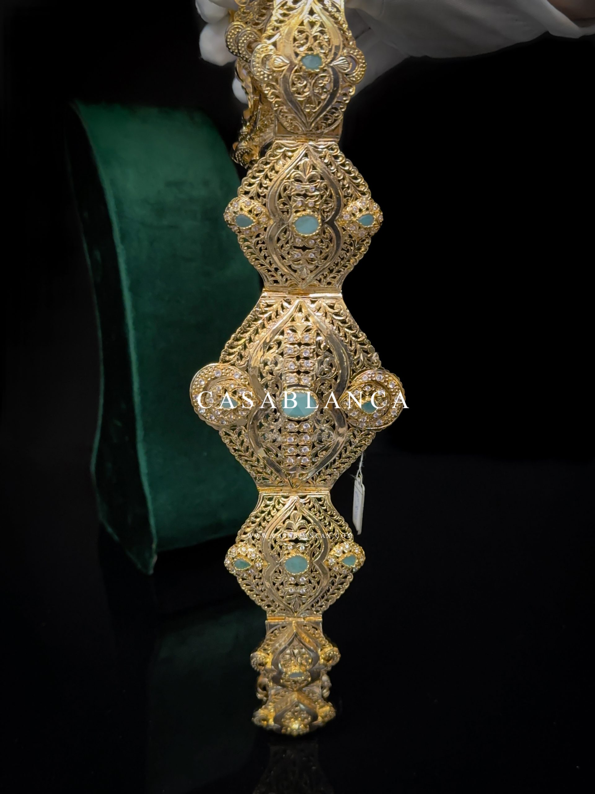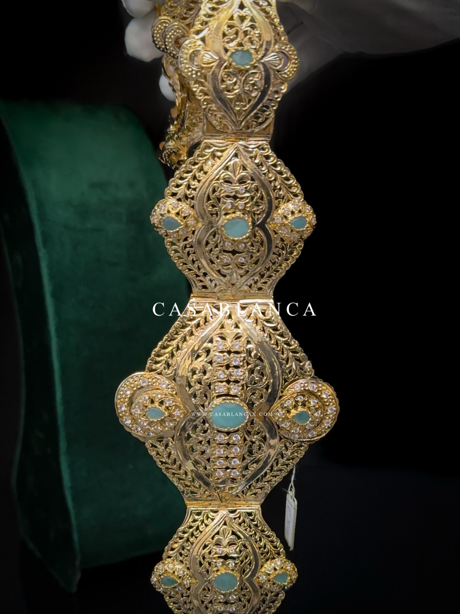 Deze riemen worden volledig ambachtelijk en handgemaakt in een Marokkaans atelier met dezelfde technieken als echt goud en zilver. We gebruiken echt koper als basis, dat vervolgens professioneel verguld wordt met goud, ook wel Nḥess mchellal النّحاس مْشَلَّل genoemd. Daarnaast verwerken we echte smaragd- en robijnstenen, die niet worden gelijmd maar gezet,  een traditionele techniek die veel vakmanschap vereist. Dit alles zorgt voor een luxueuze, duurzame en authentieke afwerking die niet te vergelijken is met massaproducten of andere sieraden en riemen.
