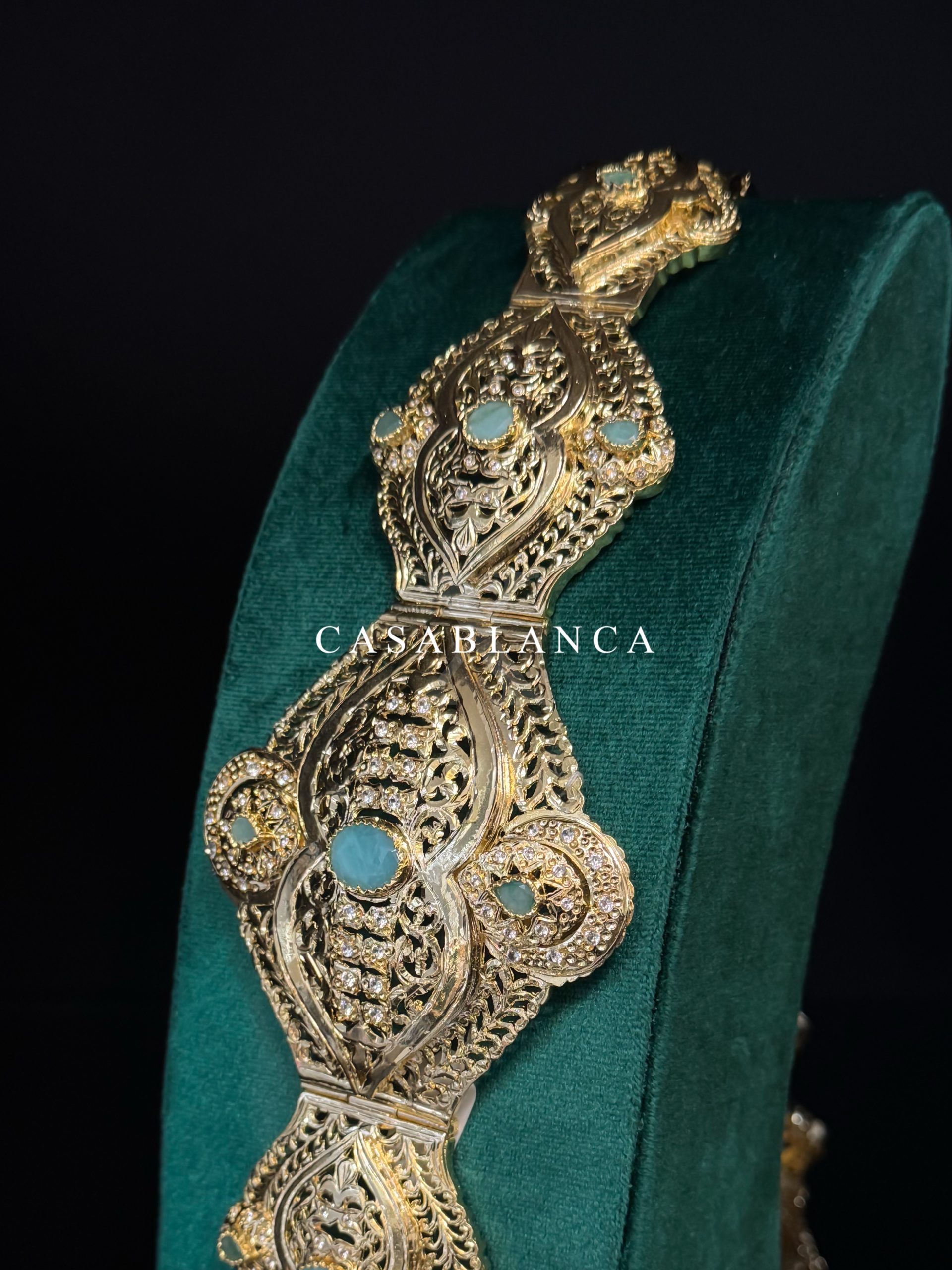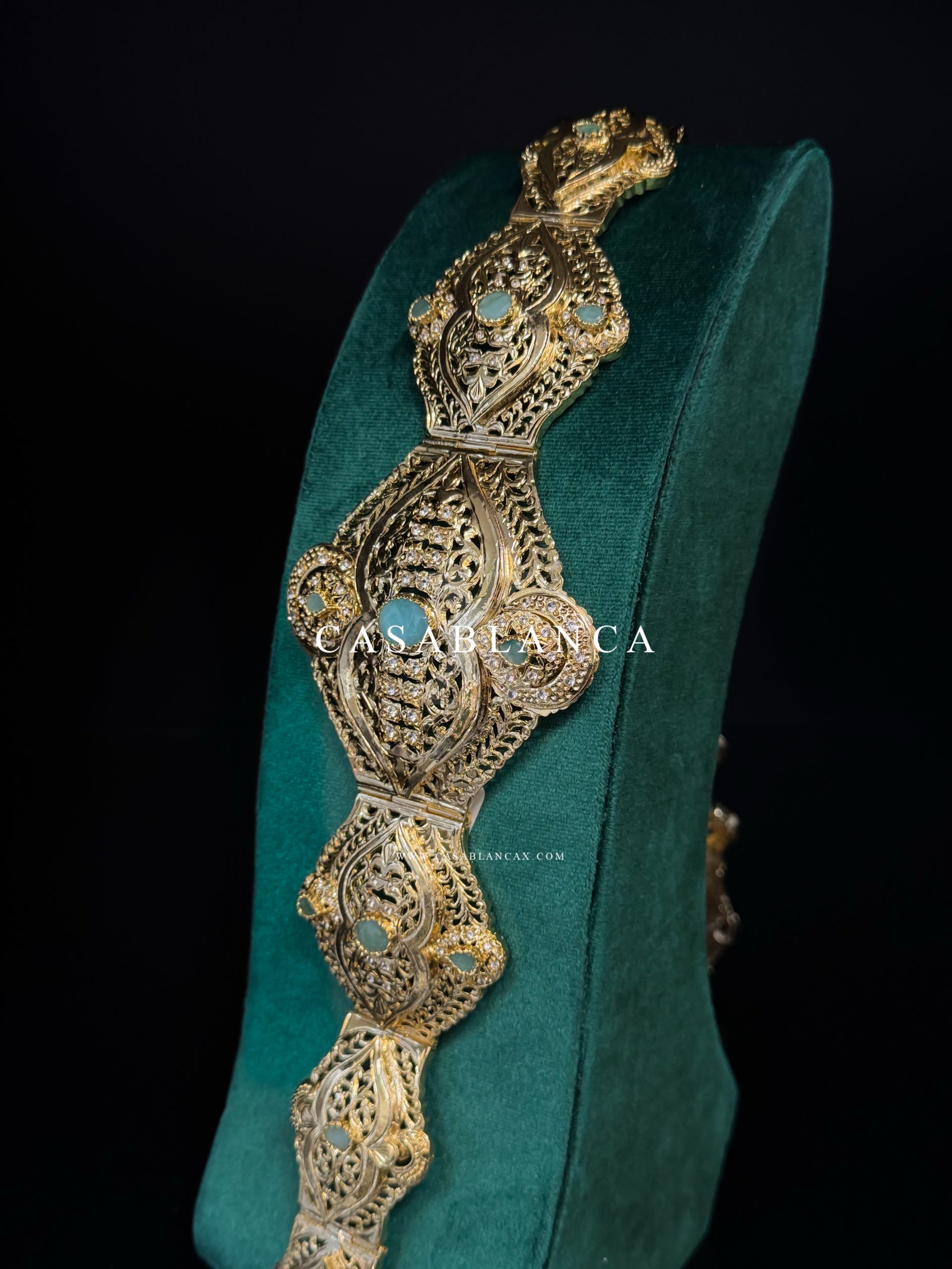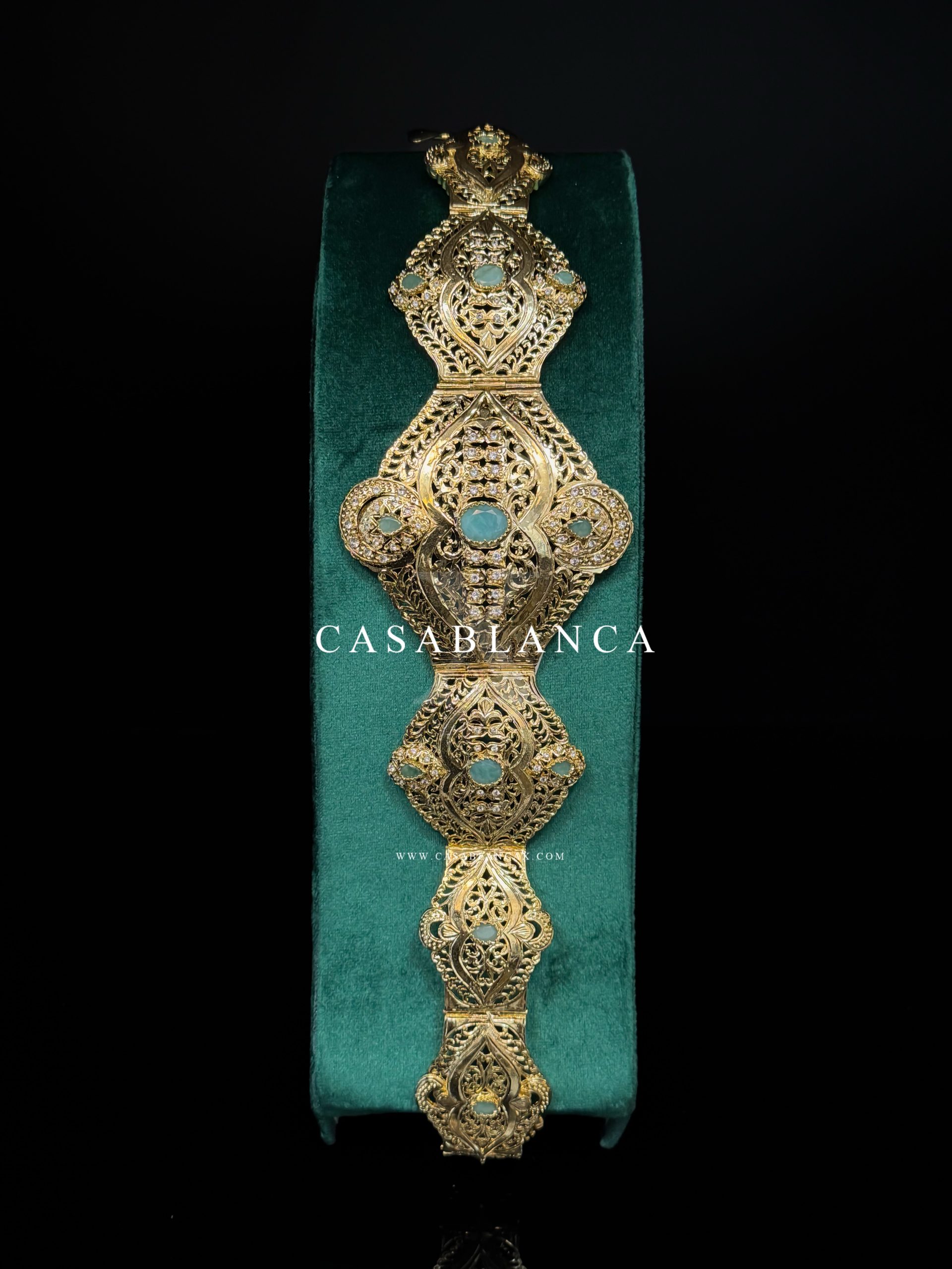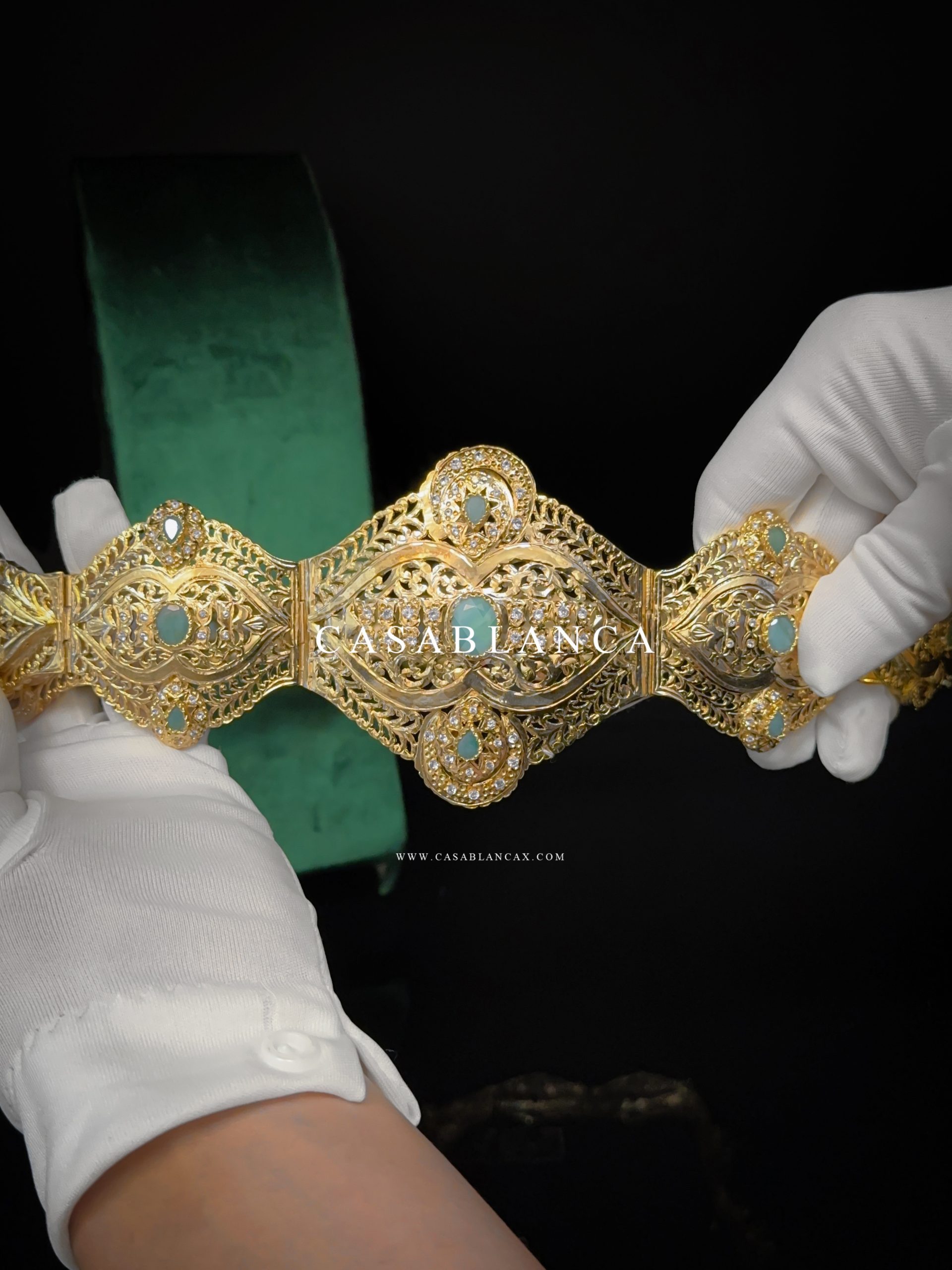 D'oro mdamma riem, afgewerkt met echte smaragd stenen. Verstelbaar, handgemaakt in Marokko van verguld koper.