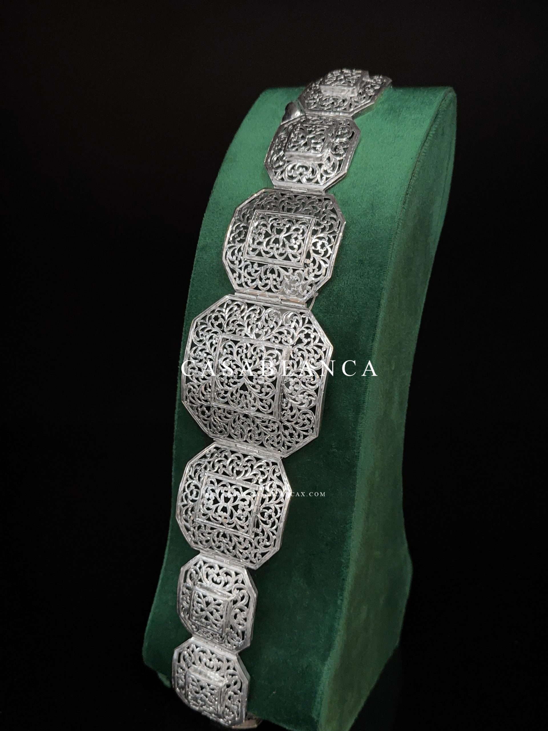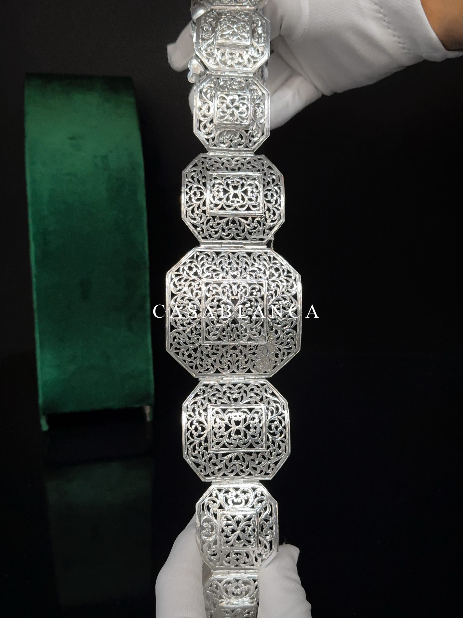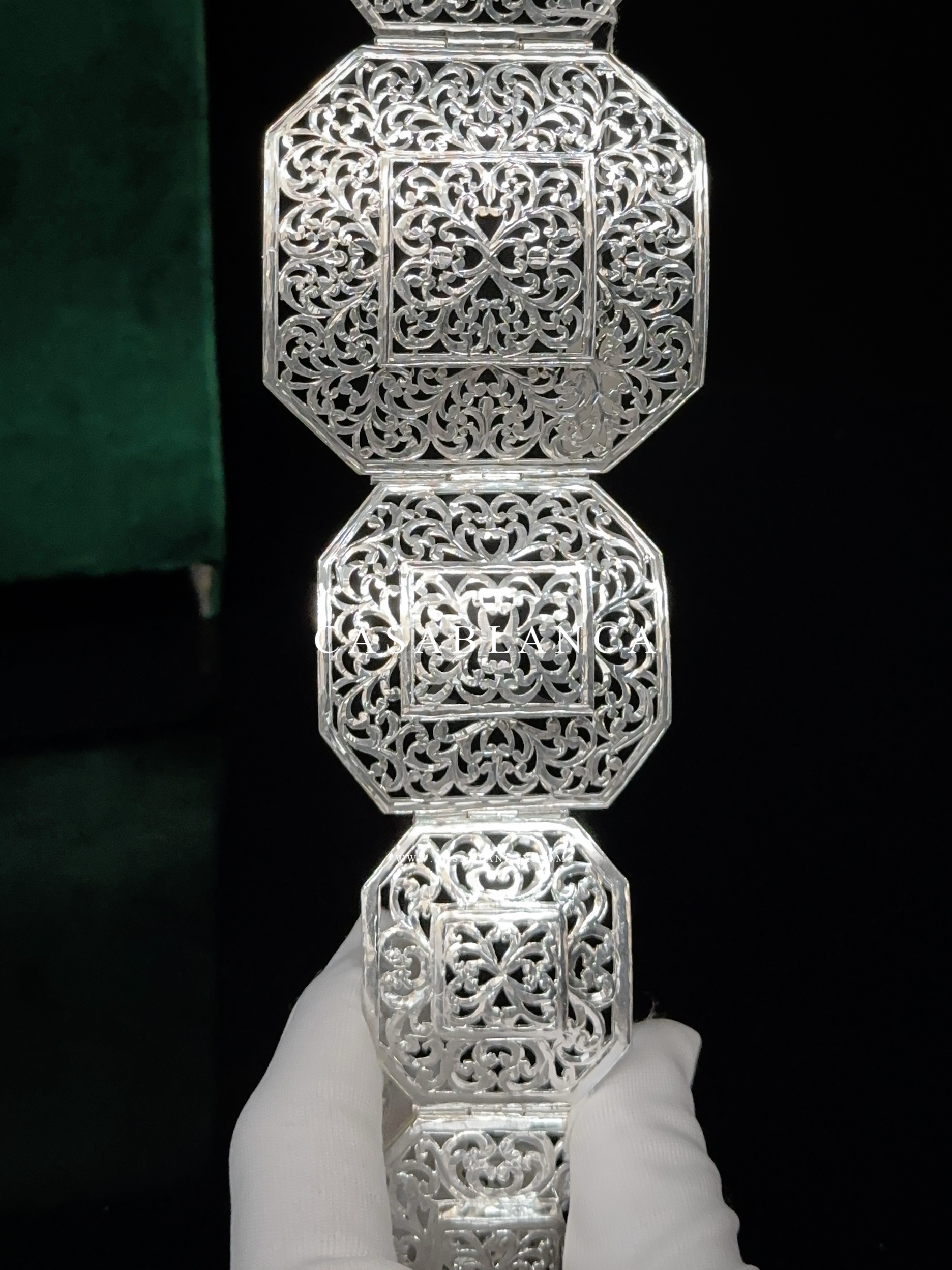 Deze riemen worden volledig ambachtelijk en handgemaakt in een Marokkaans atelier met dezelfde technieken als echt goud en zilver. We gebruiken echt koper als basis, dat vervolgens professioneel verguld wordt met zilver, ook wel Nḥess mchellal النّحاس مْشَلَّل genoemd. Daarnaast verwerken we echte smaragd- en robijnstenen, die niet worden gelijmd maar gezet, een traditionele techniek die veel vakmanschap vereist. Dit alles zorgt voor een luxueuze, duurzame en authentieke afwerking die niet te vergelijken is met massaproducten of andere sieraden en riemen.