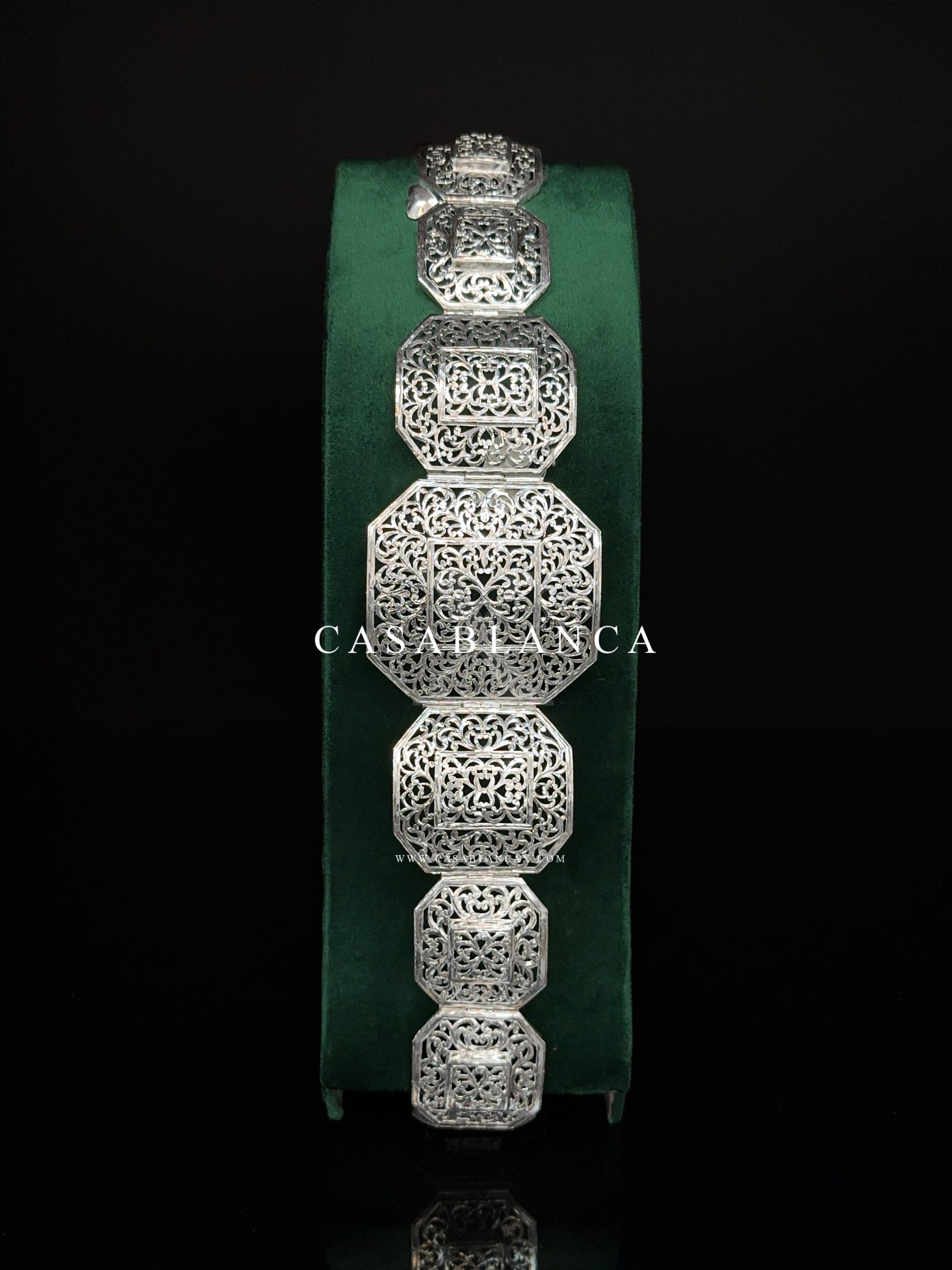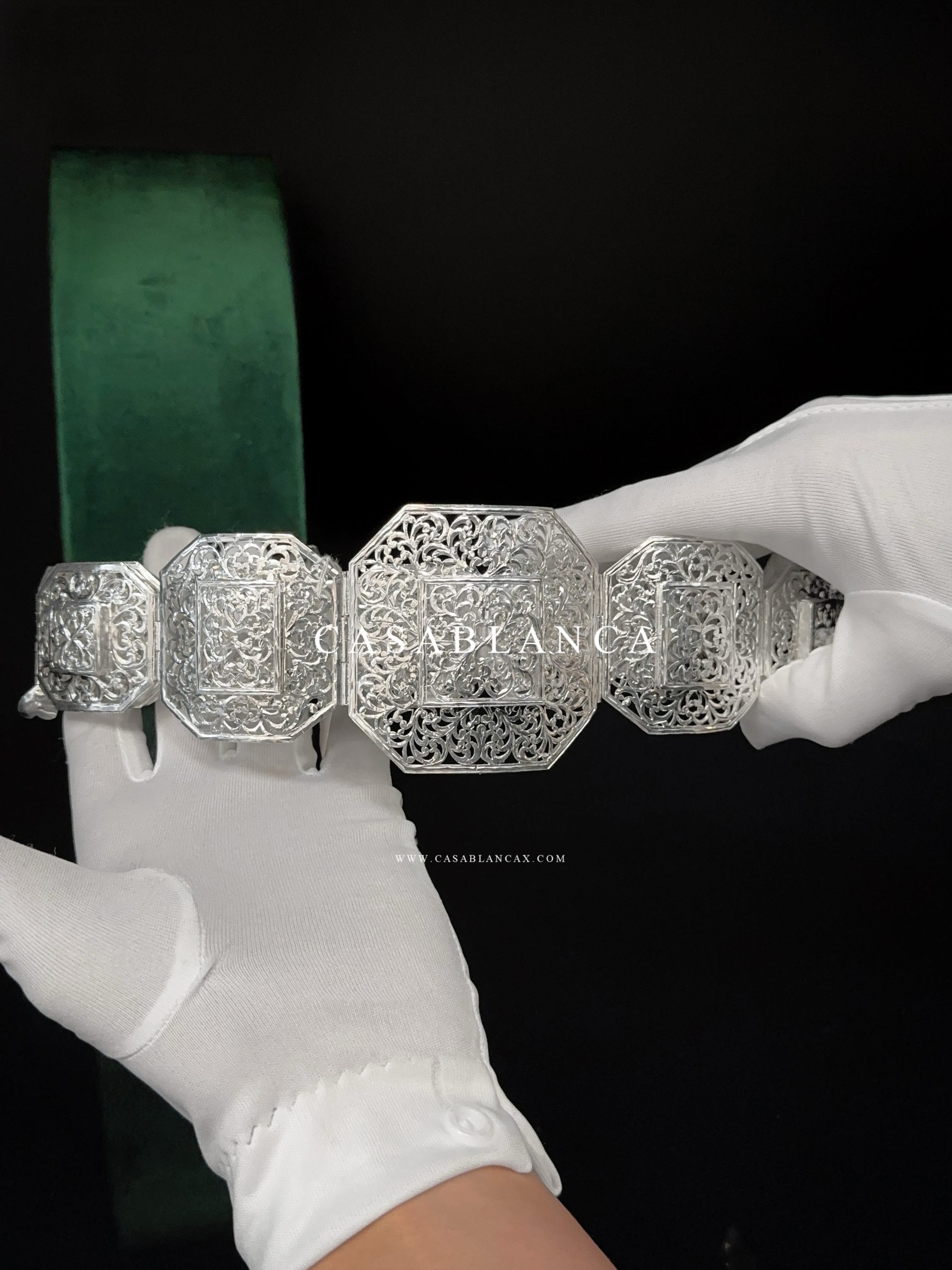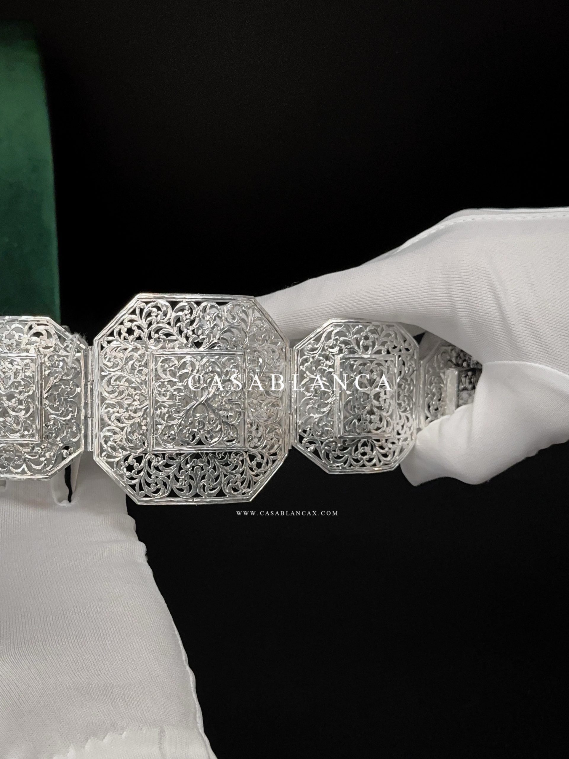 Deze riemen worden volledig ambachtelijk en handgemaakt in een Marokkaans atelier met dezelfde technieken als echt goud en zilver. We gebruiken echt koper als basis, dat vervolgens professioneel verguld wordt met zilver, ook wel Nḥess mchellal النّحاس مْشَلَّل genoemd. Daarnaast verwerken we echte smaragd- en robijnstenen, die niet worden gelijmd maar gezet, een traditionele techniek die veel vakmanschap vereist. Dit alles zorgt voor een luxueuze, duurzame en authentieke afwerking die niet te vergelijken is met massaproducten of andere sieraden en riemen.