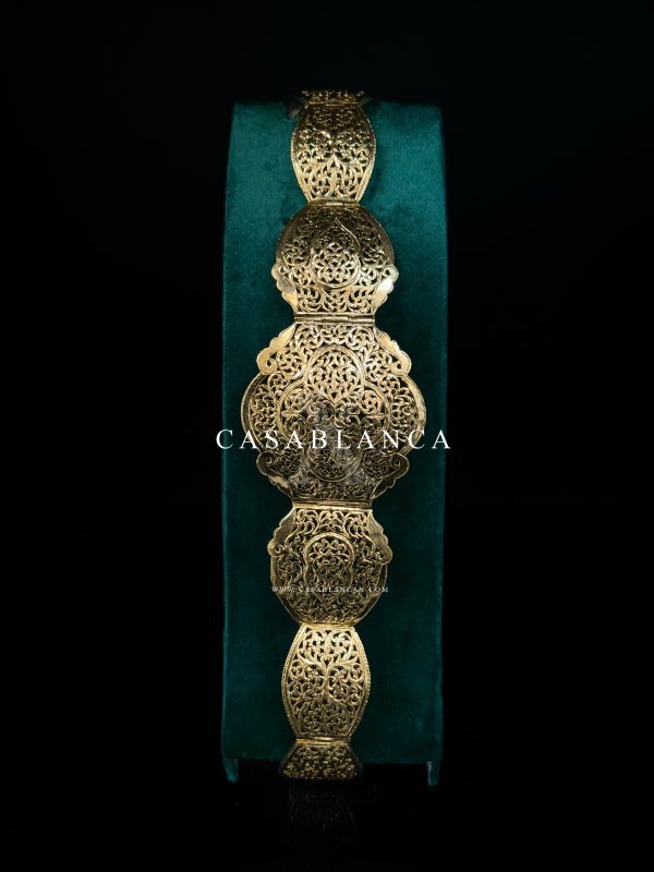 Deze riemen worden volledig ambachtelijk en handgemaakt in een Marokkaans atelier met dezelfde technieken als echt goud en zilver. We gebruiken echt koper als basis, dat vervolgens professioneel verguld wordt met goud, ook wel Nḥess mchellal النّحاس مْشَلَّل genoemd. Daarnaast verwerken we echte smaragd- en robijnstenen, die niet worden gelijmd maar gezet,  een traditionele techniek die veel vakmanschap vereist. Dit alles zorgt voor een luxueuze, duurzame en authentieke afwerking die niet te vergelijken is met massaproducten of andere sieraden en riemen.