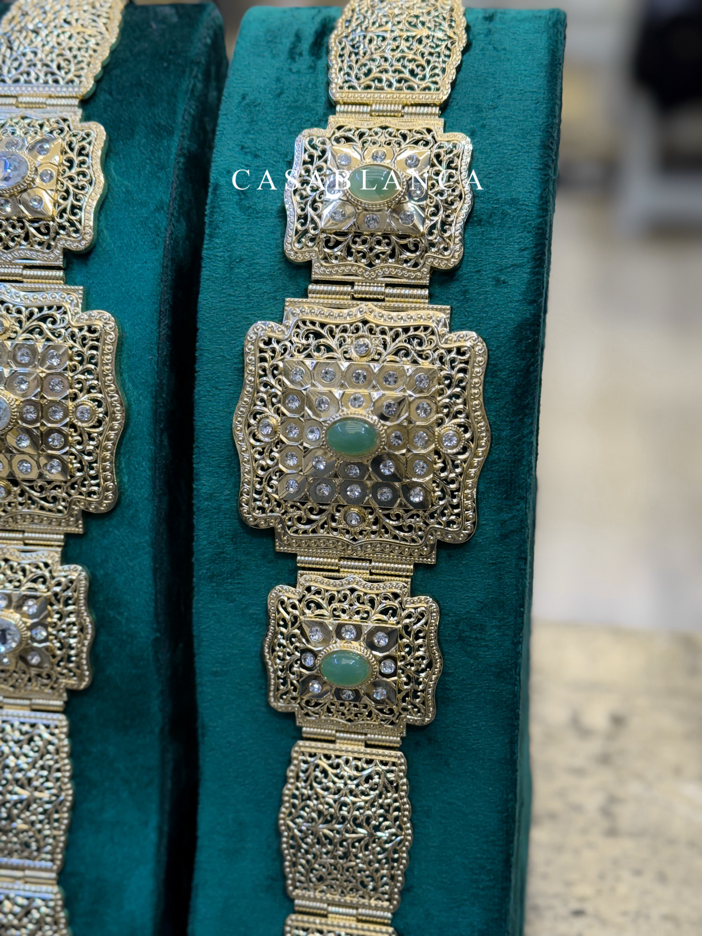 Gouden riemen, traditioneel model, verstelbaar. Kies uit goud met neutrale stenen of goud met mint groene stenen.