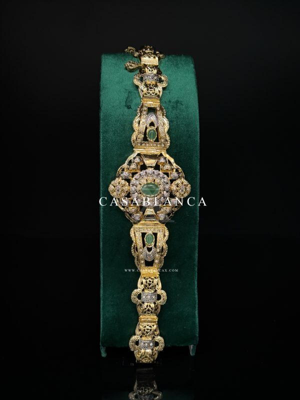 Gouden mdamma riem, afgewerkt met groene stenen. Verstelbaar, handgemaakt in Marokko van verguld koper met een prachtige subtiele zilveren bewerking.