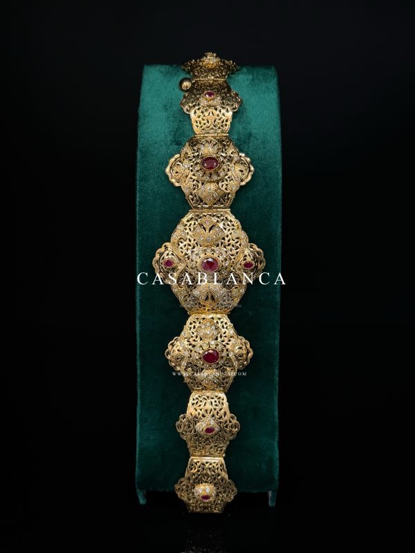 Deze riemen worden volledig ambachtelijk en handgemaakt in een Marokkaans atelier met dezelfde technieken als echt goud en zilver. We gebruiken echt koper als basis, dat vervolgens professioneel verguld wordt met goud, ook wel Nḥess mchellal النّحاس مْشَلَّل genoemd. Daarnaast verwerken we echte smaragd- en robijnstenen, die niet worden gelijmd maar gezet,  een traditionele techniek die veel vakmanschap vereist. Dit alles zorgt voor een luxueuze, duurzame en authentieke afwerking die niet te vergelijken is met massaproducten of andere sieraden en riemen.